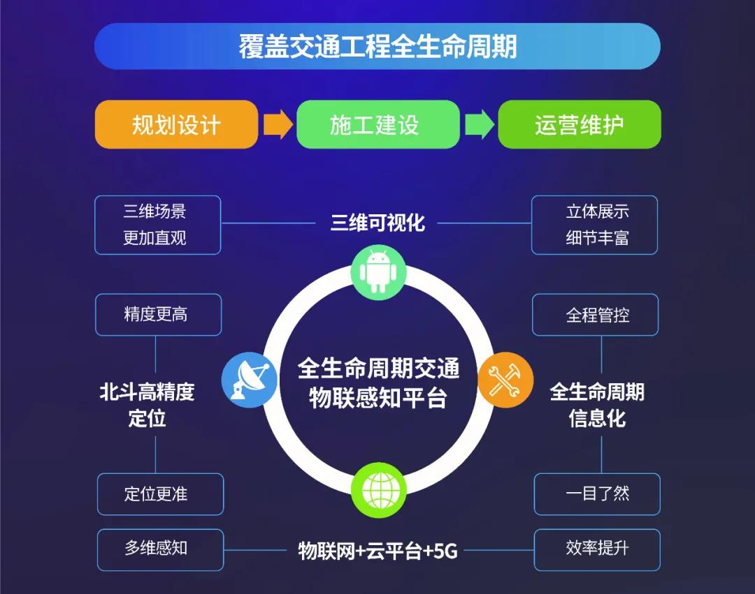 平臺(tái)基于北斗+三維+物聯(lián)網(wǎng)+云平臺(tái)等技術(shù),建立全生命周期的精細(xì)動(dòng)態(tài)管理系統(tǒng),針對(duì)工程規(guī)劃設(shè)計(jì)、工程施工建設(shè)、工程運(yùn)營(yíng)維護(hù)三個(gè)階段,提供三維可視化的交通物聯(lián)感知服務(wù),有效提升交通工程全生命周期的管控效率和水平。